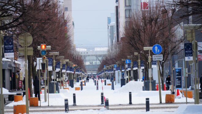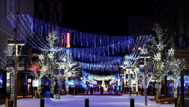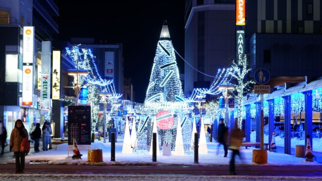 JR旭川駅から続く駅前通り「買物公園」では、「ユキノアサヒカワ」イベントが開催されており、白い雪景色に映える「イルミネーション」が大変キレイで、観光客をはじめ地元の方にも人気です。